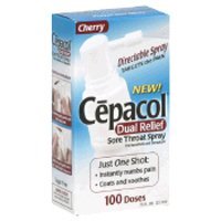 - Cepacol Dual Relief Sore Throat Spray Uses for the temporary relief of occasional minor irritation, pain, sore mouth and sore throat pain due to canker sores.